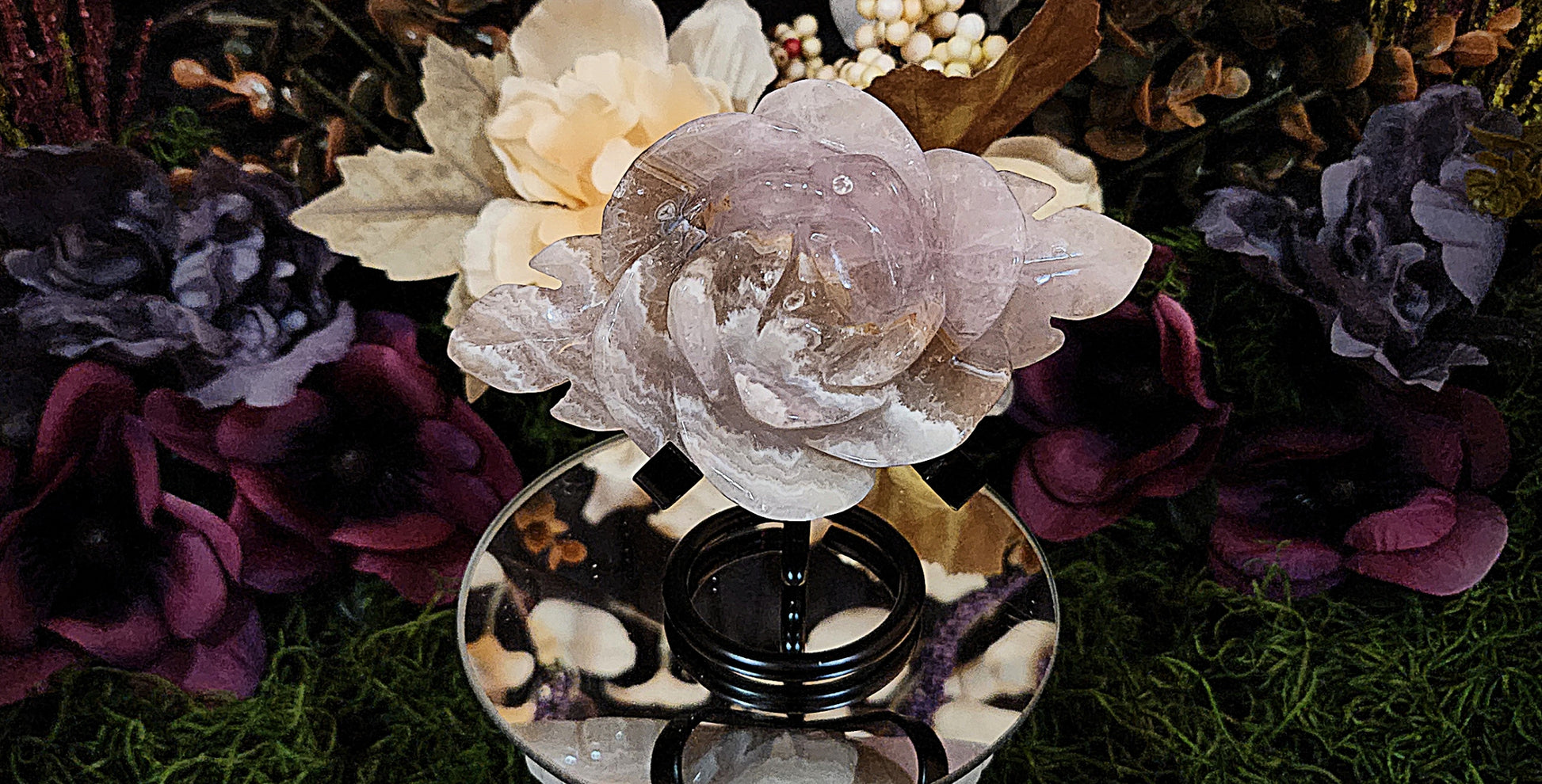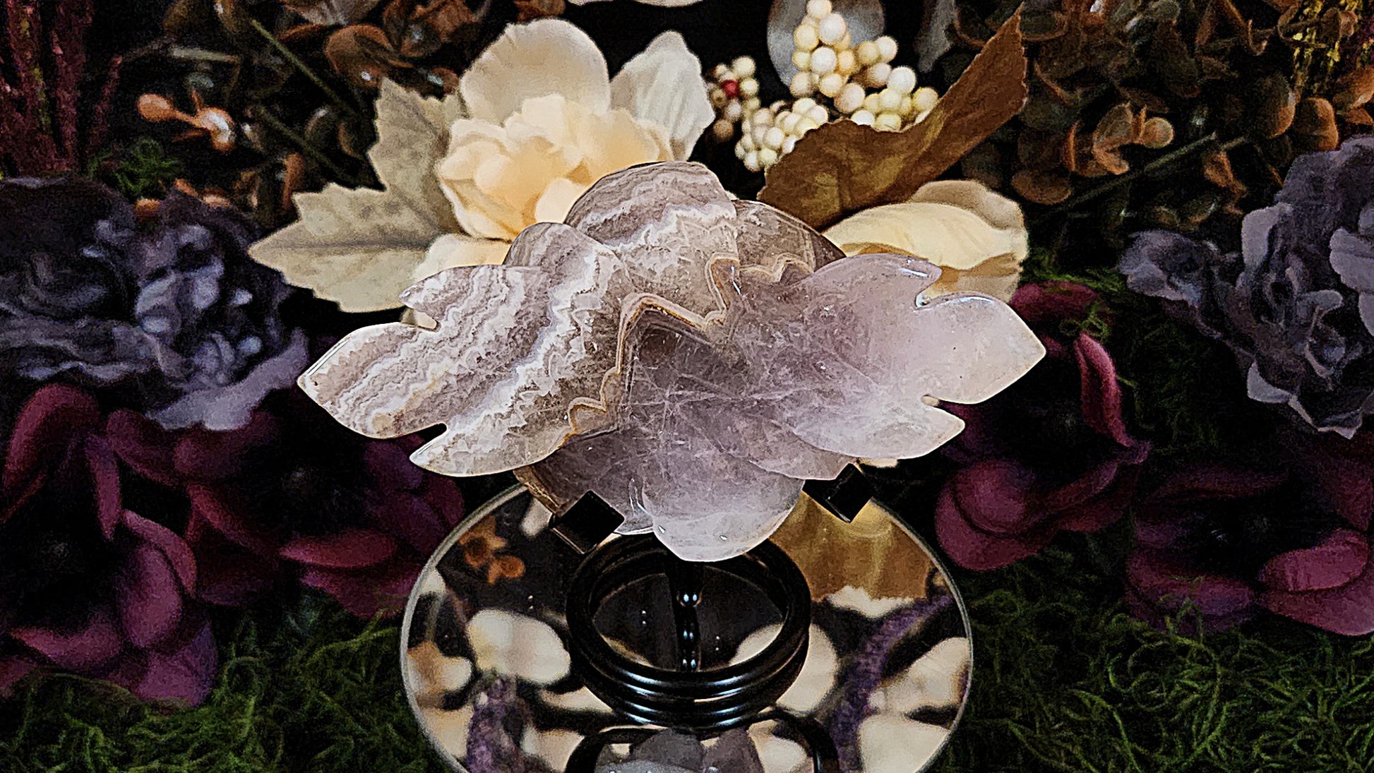 Hand-carved Crazy Lace Amethyst Rose. A beautiful, one-of-a-kind Amethyst rose, meticulously hand-carved to perfection. This Crazy Lace Amethyst rose is unique, showcasing the natural beauty and subtle variations of the Amethyst crystal.