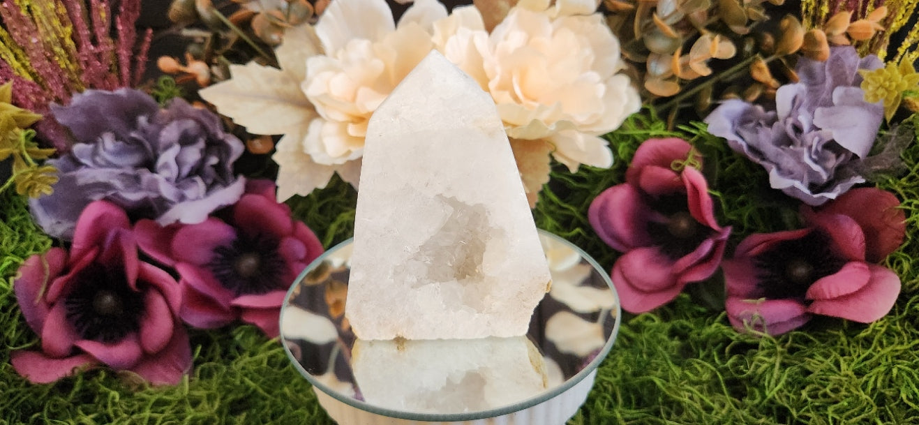 Beautiful Druzy Snow Agate Tower. Also sometimes referred to as milky quartz or clear quartz.